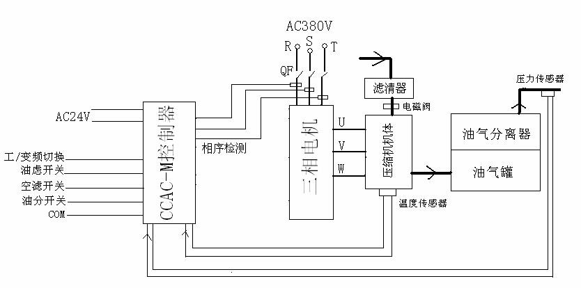 工頻頻驅動方式下,壓力傳感器檢測空壓機出氣口排氣壓力,根據設定的“上限壓力設置”和“下限壓力設置”值進行進氣閥的開啟和關閉操作,使得出口壓力穩定在“上限壓力設置”與“下限壓力設置”值之間。由于螺桿式壓縮機嚴格要求不允許反轉,控制器會檢測引入空壓機系統的交流電源的相序,若有相序異常,將發出報警,使系統不能進入運行狀態。