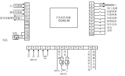 與變頻器組成空壓機控制系統時,用戶可選用東元空壓機控制器CCAC,也可選用普樂特控制器(內置東元變頻器驅動),本文主要講述臺安空壓機控制器CCAC與東元A510變頻器組成的控制系統在螺桿式空壓機上的應用。