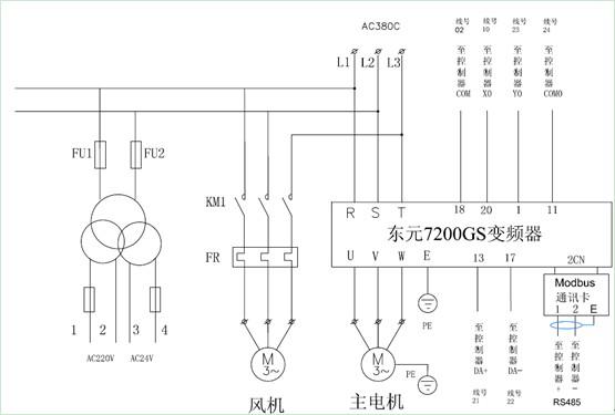 ⑴ 根據(jù)東元7200GS變頻器及臺安CCAC-M型空壓機控制器的規(guī)格,完成電源線及控制線的配線,注意變頻器外圍選購件(如:空開、斷路器、電抗器等)的連接及所用動力線的線徑、材質(zhì)。