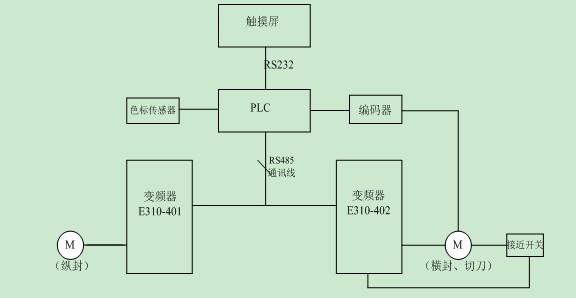 兩臺E310變頻器由一臺PLC通訊控制,縱封由一臺異步電機(jī)單獨拖動,橫封和切刀由另一臺異步電機(jī)拖動。正常運行時要求兩臺電機(jī)保持同步,主運行頻率由PLC給定,以保證袋長的精度。同時,薄膜標(biāo)記傳感器不斷的在檢測薄膜標(biāo)記(色標(biāo)),機(jī)械部分的編碼器檢測主軸機(jī)械位置,上述兩種信號送至PLC,經(jīng)程序運算后,如果偏差超過允許值,則由PLC輸出段速信號給控制橫封和切刀的變頻器,段速的切換由接近開關(guān)控制,主軸每轉(zhuǎn)動一圈接近開關(guān)導(dǎo)通一次,導(dǎo)通時間占1/3,以時時調(diào)整橫封和切刀速度,補(bǔ)償偏差,從而把包裝袋長精確控制在一定范圍內(nèi)。檢測若在追蹤預(yù)定次數(shù)后仍不能達(dá)到技術(shù)要求,可自動停機(jī)待檢,避免廢品的產(chǎn)生。