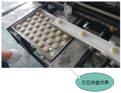 2.推盤動作:落餅完成一行后,X軸回原點,Y軸伺服推動托盤一定距離(根據工藝設定),第二行落餅開始。